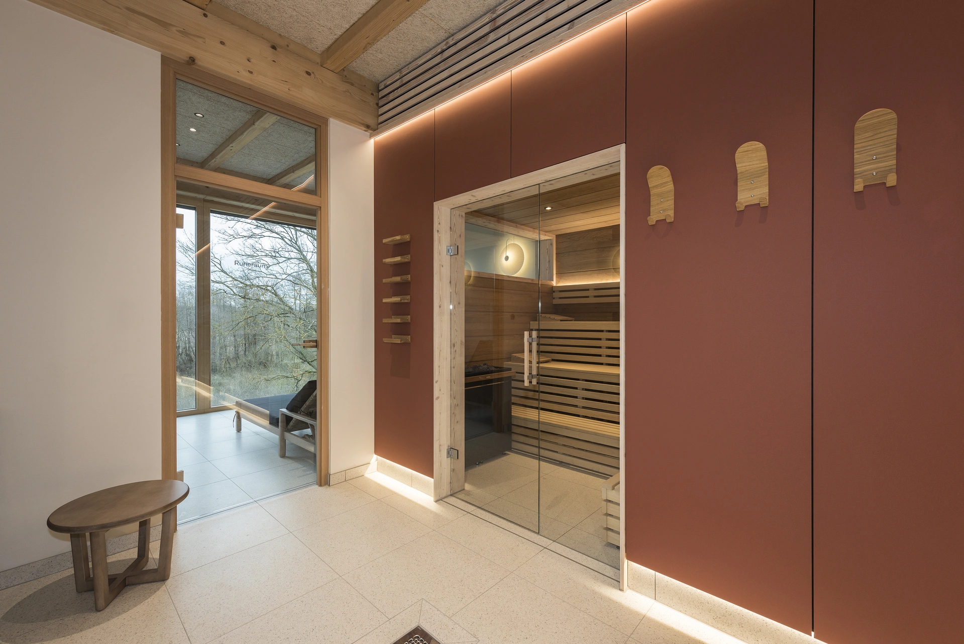 Panoramafenster, große Terrasse und Seeblick im Gartengeschoss des Saunahauses. Für 25–50 Personen, Leinwand, Beamer. Ideal für Workshops, Seminare, Teamtage, Kurse, Feiern – kombinierbar mit Sauna und Übernachtung.
