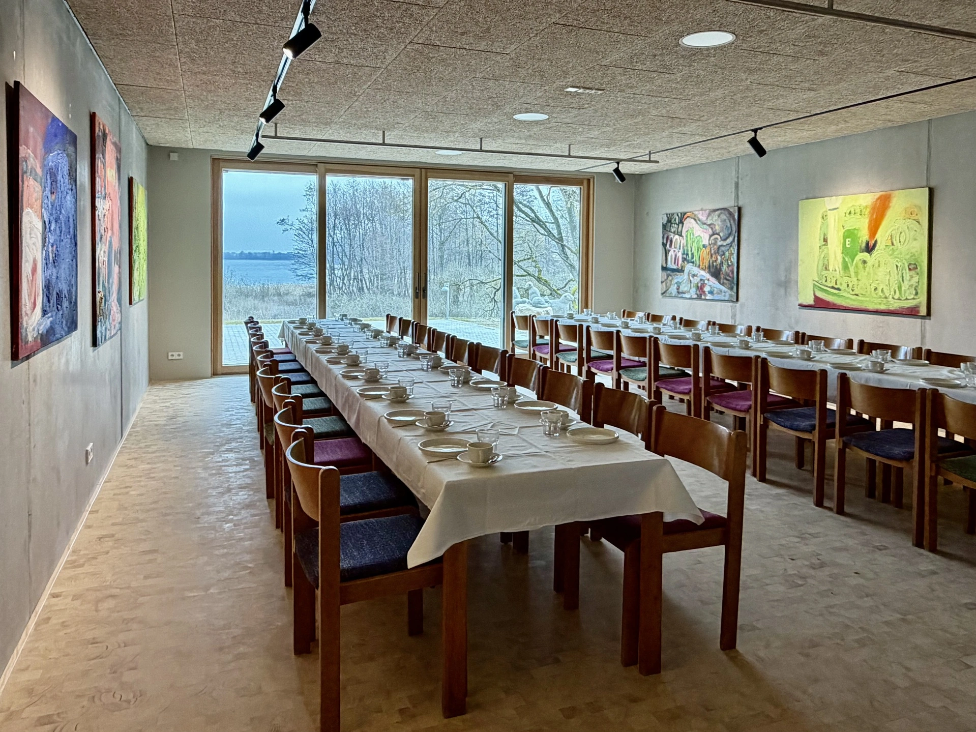 Panoramafenster, große Terrasse und Seeblick im Gartengeschoss des Saunahauses. Für 25–50 Personen, Leinwand, Beamer. Ideal für Workshops, Seminare, Teamtage, Kurse, Feiern – kombinierbar mit Sauna und Übernachtung.