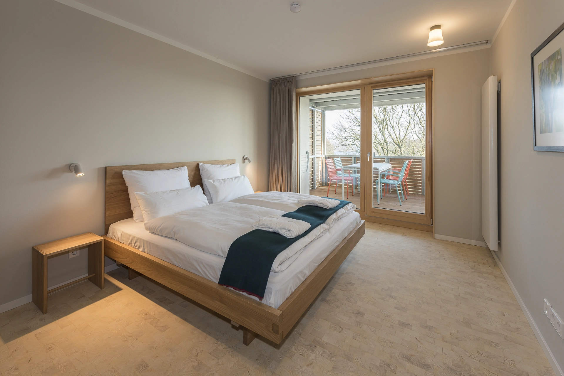 24 Ferienwohnungen in verschiedenen Größen – vom kompakten Apartment für 2 bis zur großzügigen Wohnung für 6 Personen. Alle mit Balkon und Blick Richtung See. Eichenmöbel, Stirnholzparkett, klares Design. vollausgestattete Küchen, moderne Bäder, Wäschepaket inklusive. Sauna-Nutzung inklusive. Check-in ab 16 Uhr, kontaktlos per persönlichem Zugangscode. Hunde willkommen (auf Anfrage). Barrierearme Wohnungen verfügbar. Babybett auf Wunsch.